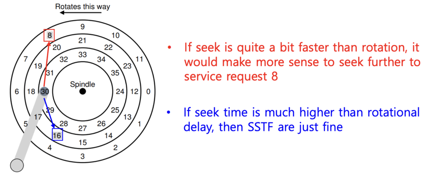 현대 드라이브에서는 탐색(Seek)과 회전(Rotation)의 시간이 비슷하다. SPTF는 탐색 시간과 회전 시간을 모두 고려하여, 가장 짧은 위치 지정 시간(Positioning Time)을 우선으로 처리한다.