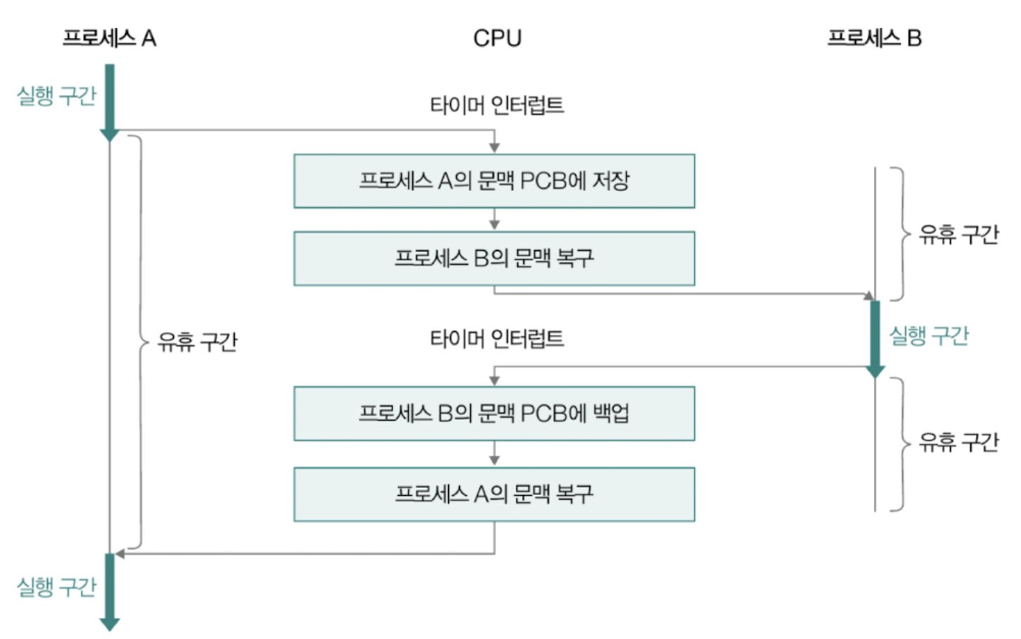 위처럼 기존 프로세스의 문맥을 PCB에 백업하고 PCB에서 문맥을 복구하여 새로운 프로세스를 실행하는 것을 문맥 교환이라고 한다.