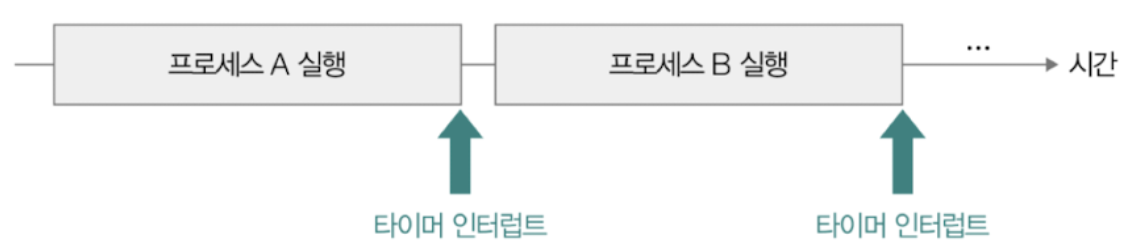 프로세스의 CPU사용 시간은 타이머 인터럽트에 의해 제한된다. 타이머 인터럽트(타임아웃 인터럽트)는 시간이 끝났음을 알린다.